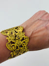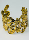 Dieses elegante Armreif-Armband besticht durch ein filigranes, spitzeninspiriertes Cut-out-Design in luxuriösem Goldton. Seine kunstvollen Blumen- und Schnörkelmotive machen es zum perfekten Statement-Accessoire für moderne und Vintage-inspirierte Stile.