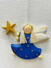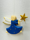 This cute wooden angel is dressed in a blue dress with golden stars and holds a gold star wand.